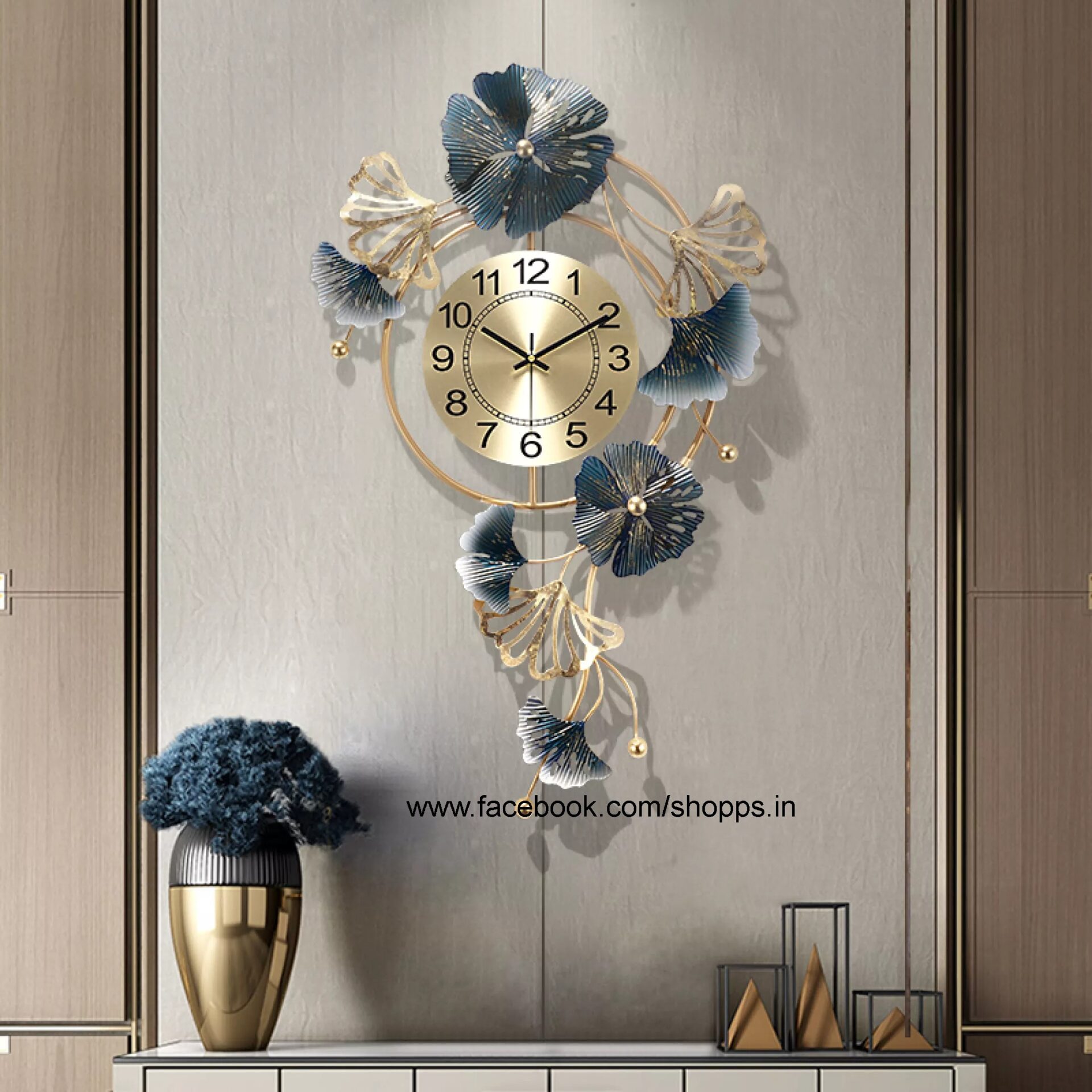 Metal golden and blue dark bluish color leaves and a nice clock to decorate your home with .